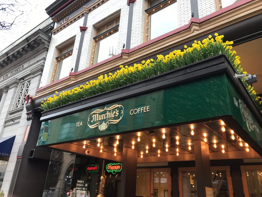 Murchie’s facade, sporting daffodils